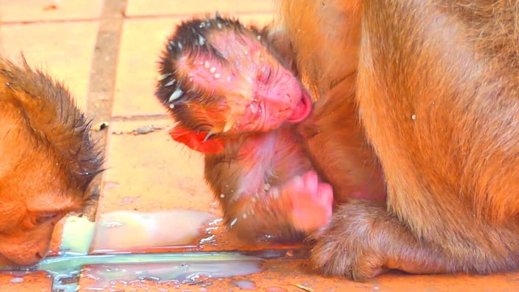In the soft morning light, a heartwarming scene unfolds in the forest. A newborn baby monkey, so tiny and fragile, presses close to its mother’s chest, searching eagerly for comfort and nourishment. The little one’s hands tremble as it clings to her fur, and its small face lights up with relief when it finds the warmth of her milk. The mother monkey responds with a gentle embrace, wrapping her arms securely around her baby as if to shield it from the entire world.