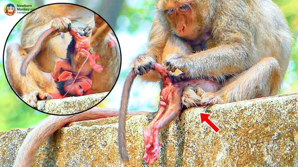 In a peaceful corner of the jungle, the miracle of life unfolds. A newborn monkey has just entered the world, still wet from birth and clinging tightly to its mother’s chest. The mother monkey, overwhelmed with instinct and emotion, gently cradles her tiny baby in her arms. Her eyes, wide and focused, scan every inch of her newborn — checking its limbs, fingers, and tiny face with care and love.