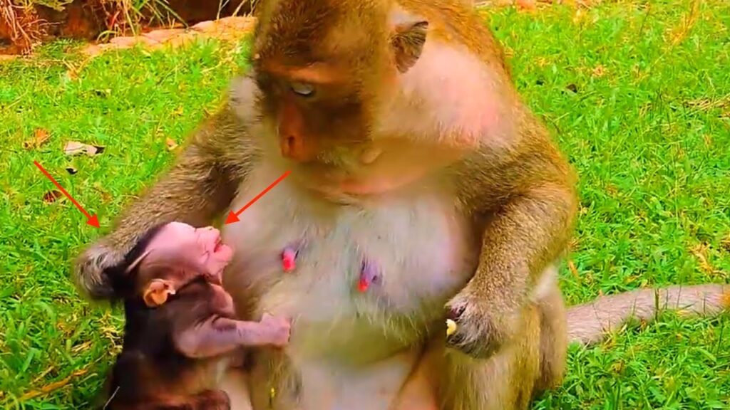 In the quiet corner of the family, a gentle scene unfolds. The oldest mother, with her eyes softened by years of wisdom and experience, leans close to the newborn baby. She shakes her head slowly, whispering, “No, no…” not in anger, but in the kind of tender correction that comes from love. She knows what the little one needs most in these first fragile days—warmth, comfort, and above all, plenty of milk.