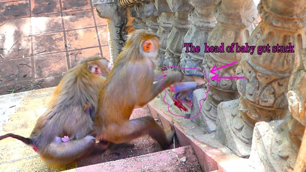 In the heart of the jungle, where every day brings new challenges for survival, a touching scene unfolded that showed the pure bond of care between two monkeys. Baby Luna, still very young and curious, was exploring her surroundings with playful energy. Her tiny steps carried her close to a tree hole, where she decided to peek inside out of innocent curiosity. Unfortunately, her little head slipped too far, and soon she found herself stuck. Luna began to cry loudly, struggling in panic, unable to free herself.