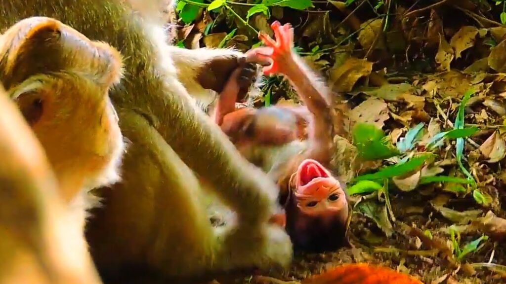 The baby, still fragile, had been practicing his small steps, hopping from branch to branch and occasionally tugging at his mother’s fur for comfort. Suddenly, the old mother reached out and pulled the baby’s tail back, perhaps in an attempt to discipline or simply show dominance. The baby squealed in surprise, his innocent eyes widening in shock. The playful curiosity turned into a sharp cry of anger. His tiny fists waved, and his soft face wrinkled as if saying, “Why would you do this to me?”
