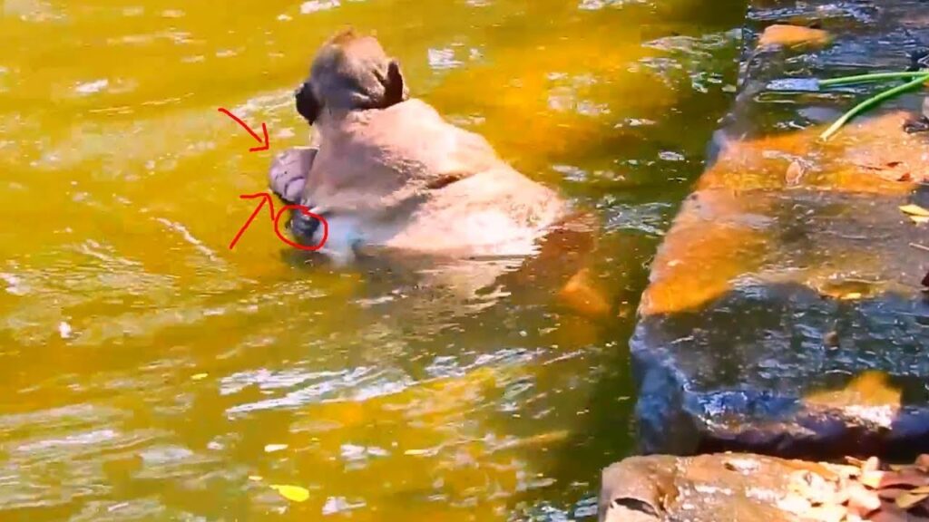 It was a moment that tugged at the heart—so raw, so real. The river was wide and the current gentle, but for a tiny baby monkey, it felt like a terrifying ocean. Perched on his mother’s back, the little one clung tightly, eyes wide with fear, his tiny fingers digging into her wet fur. Every splash made him flinch, and every ripple seemed like a wave to his inexperienced eyes.
