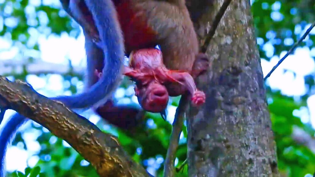 A heartbreaking moment unfolded high in the treetops when a tiny newborn baby monkey faced a terrifying brush with danger. Just hours old, the fragile infant clung weakly to its mother as she leapt from branch to branch, trying to find a safe resting spot. The leaves rustled above the jungle floor as the mother monkey misjudged her footing, and in an instant, the baby slipped from her grasp.