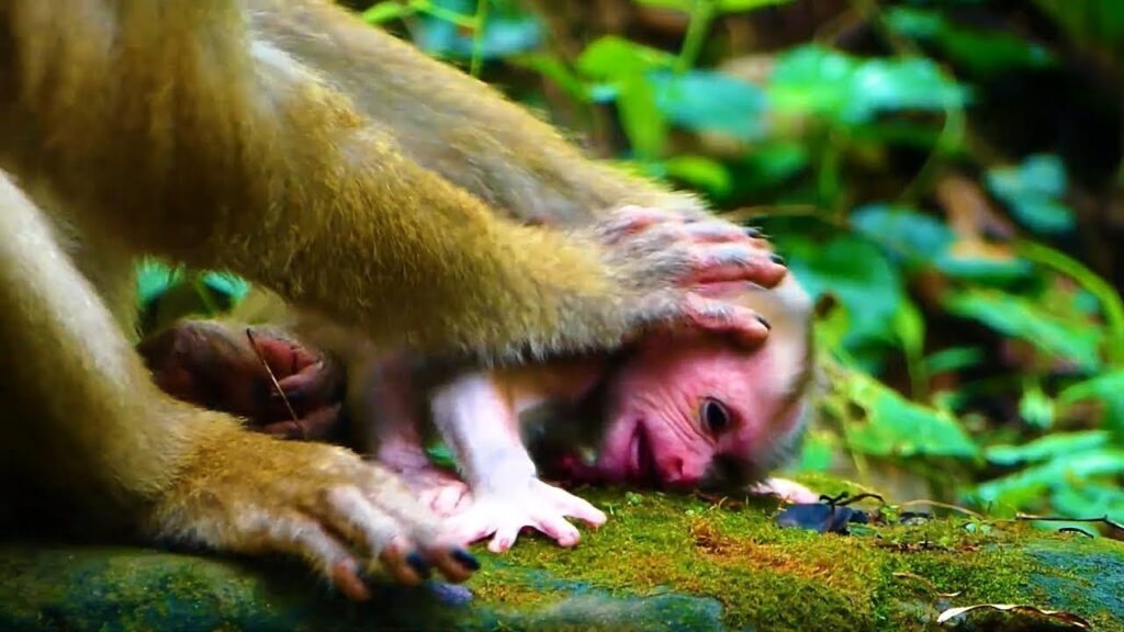 In the quiet corner of the jungle, tiny baby monkey Leo clung nervously to his mother’s fur. His small eyes glistened with both innocence and confusion as he tried to understand her sudden behavior. Usually, Mom’s embrace was warm and protective, a safe shelter where Leo felt love and comfort. But today was different. For reasons the little one could not grasp, Mom tried to press him against the rough surface of a rock nearby.