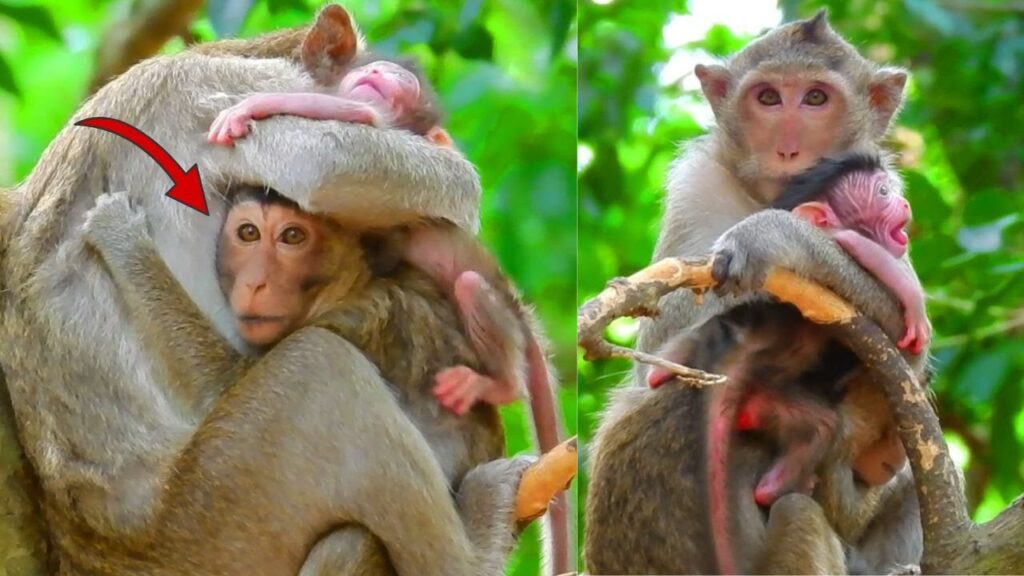 In a quiet corner of the forest, a touching yet emotional scene unfolded among the monkey family. The mother monkey sat calmly, cradling her tiny newborn in her arms, softly grooming and whispering gentle sounds of love. However, just a few feet away, her older daughter, a young monkey named Lila, watched with confusion and growing sadness in her eyes. She had always been her mother’s little one — always hugged, always protected. But now, everything seemed to have changed.