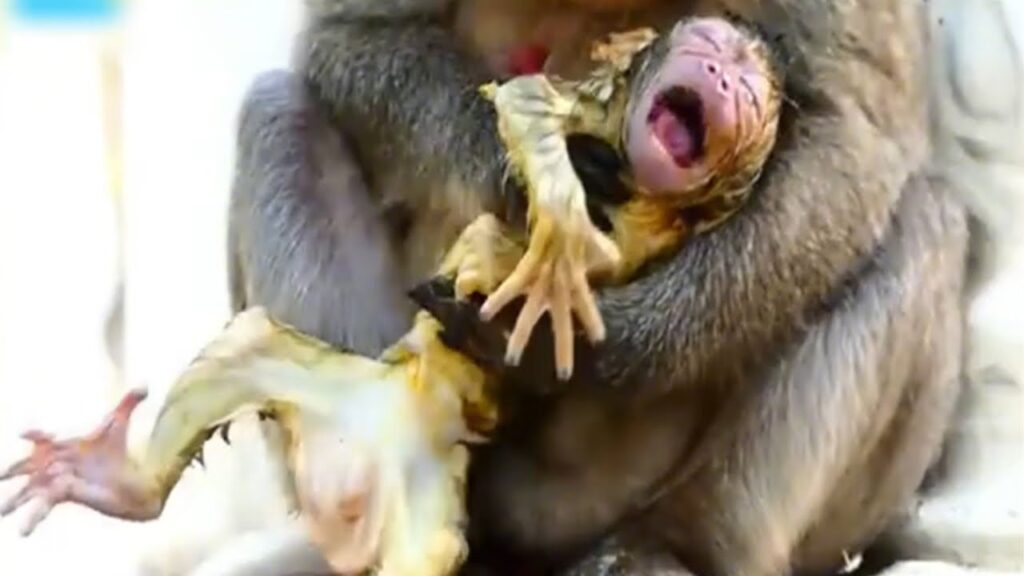 The newborn was small, pink, and helpless, clinging tightly to its mother’s warm belly. Though tired and slower than younger mothers, the old monkey showed incredible care. She groomed her baby tenderly, removing dirt and keeping its fur clean. Her hands, though aged and a bit shaky, never failed to hold the baby with steady affection.