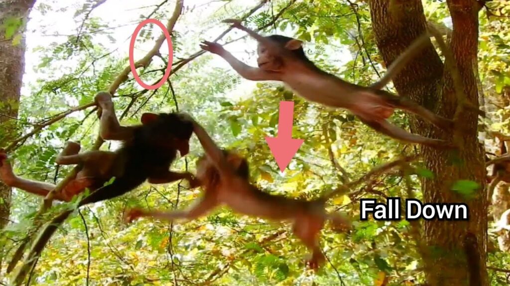 OMG!!, Baby Monkey Fall Down From The Tree, Baby Monkey Brave To Jump Unfortunately Baby Fall Down