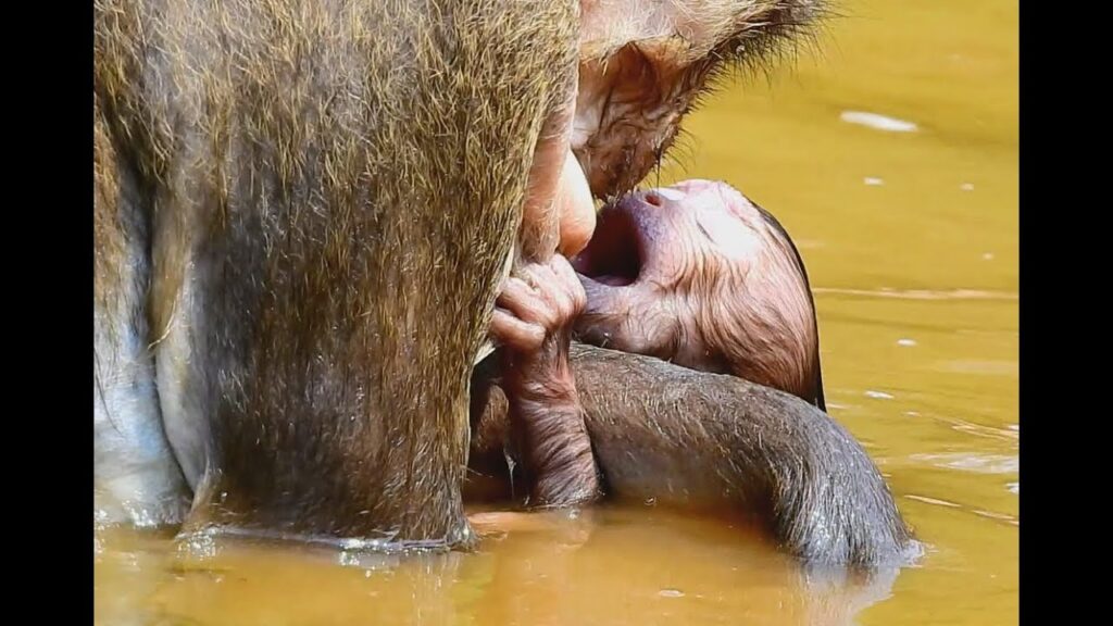 But sadly, her inexperience showed. Instead of gently holding her baby above the water, the mother dipped the tiny one too deep. The cold water rushed quickly against the newborn’s fragile body. In just a few seconds, the baby’s little face began to turn purple from shock and lack of air. The heartbreaking sight made it clear that the tiny monkey was not ready for such a challenge. The crowd of monkeys around grew restless, some chirping loudly as if warning the mother to stop.