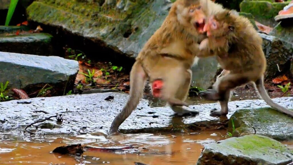 From the shadows, an old male monkey approached. His posture was not kind—he wasn’t coming to share shelter or warmth. Instead, he moved aggressively, trying to disturb the poor old female who clearly only wanted peace in the rain. She backed away slowly, her weak hands trembling as she clung to a slippery branch, but the male kept pressing forward, not showing mercy.