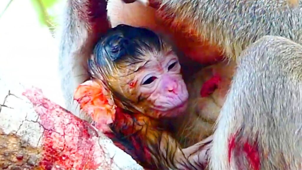 The forest grew silent for a moment, as though nature itself paused to witness the miracle. An old wild monkey mother, carrying years of wisdom and experience in her gentle eyes, had just given birth. Nestled close to her body lay a tiny, chubby baby, his skin still wrinkled from the journey into the world. The newborn’s weak cries filled the air, soft yet powerful enough to announce his arrival.