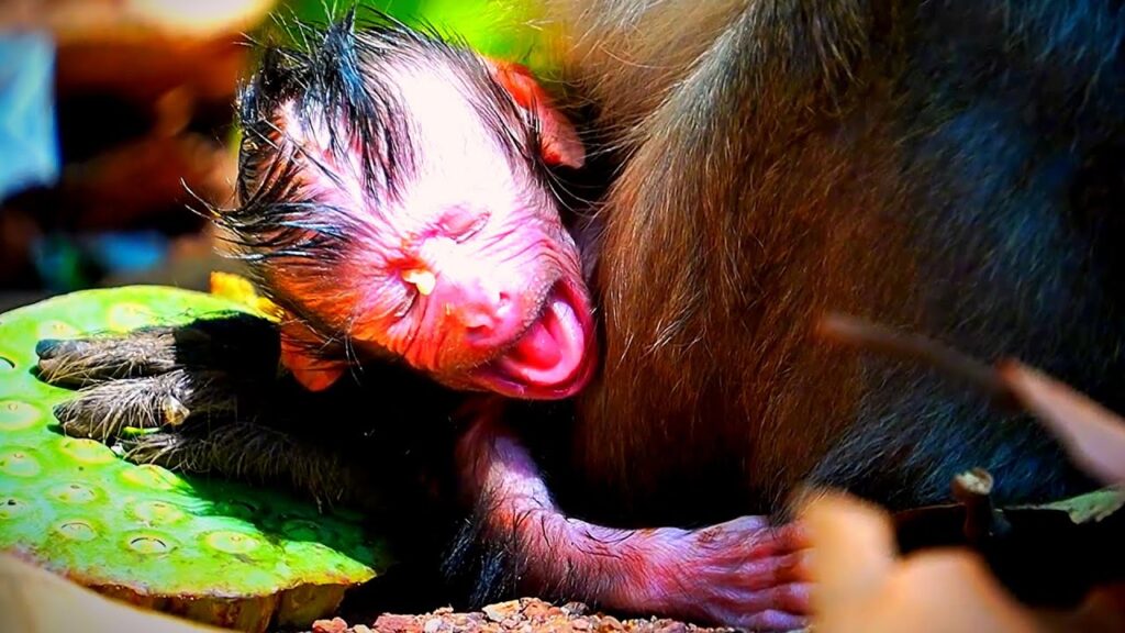 A heartbreaking scene unfolds in the forest as a tiny newborn monkey lets out soft cries, its fragile body trembling with need. The little one, only a few days old, clings tightly to its mother’s fur, eyes still adjusting to the world. Every sound from its mouth is a plea for comfort, a plea for milk. Its small lips search desperately, yet for a moment, the mother seems distracted, shifting her attention to the surroundings and other troop members.