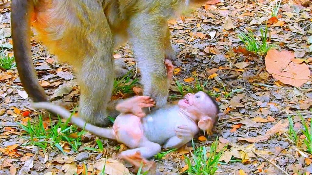 The baby monkey’s eyes look tired and scared as she tries to crawl closer to her mommy. She reaches out with her tiny hands, begging silently for care. But the mother seems unsure, sometimes pushing the baby away, sometimes leaving her alone on the cold ground. Each moment feels heartbreaking, as the baby’s cries echo like a small call for help that no one answers.