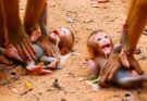 Under the tall trees, a tiny baby monkey clung to a low branch, his small fingers trembling as he cried. His belly was empty, his eyes wide and shining with hope. Every soft whimper was a question sent into the air: Mama, will you look at me? He stretched his arms again and again, asking not only for milk, but for warmth, for comfort, for a hug that could quiet his fear.