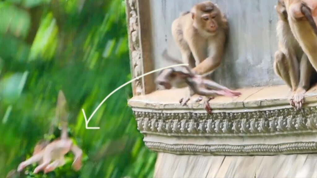 A heartbreaking scene unfolded at the ancient temple today when a poor baby monkey, still too young to defend itself, was seen falling from the high stone walls after a tragic kidnapping attempt. The temple, usually peaceful and filled with the echoes of playful monkeys, turned silent as the helpless cries of the little one pierced the air. Witnesses say the baby had been taken away by an older monkey, possibly jealous or trying to claim the baby as her own.