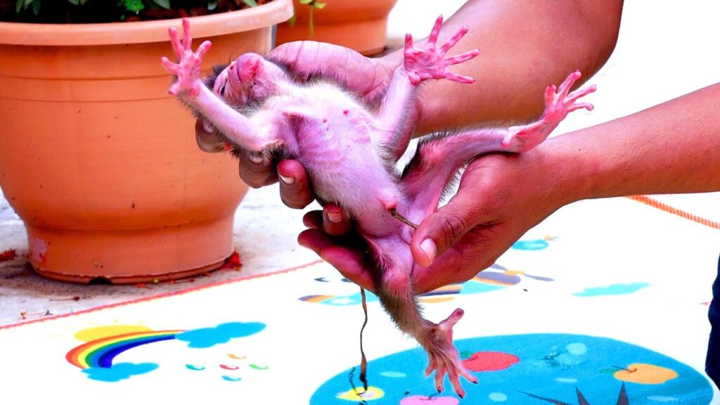 Under the dim morning light, a tiny newborn baby monkey lay trembling beside a tree root. Its fragile body was still wet from birth, and the cold ground seemed too harsh for such a tender life. The mother, thin and exhausted, looked down helplessly at her infant — the poorest newborn baby monkey in the troop.