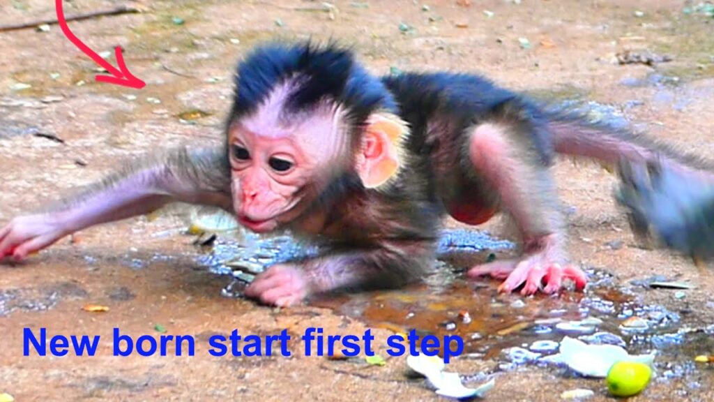 In the heart of the forest, a beautiful and tender moment unfolds between a newborn baby monkey and his devoted mother. The tiny infant, still fragile and unsure, begins to explore the world around him. His little hands tremble as he tries to balance, his curious eyes filled with both excitement and uncertainty. Each movement is slow, unsteady, and filled with effort, yet every small attempt reveals his determination to grow.
