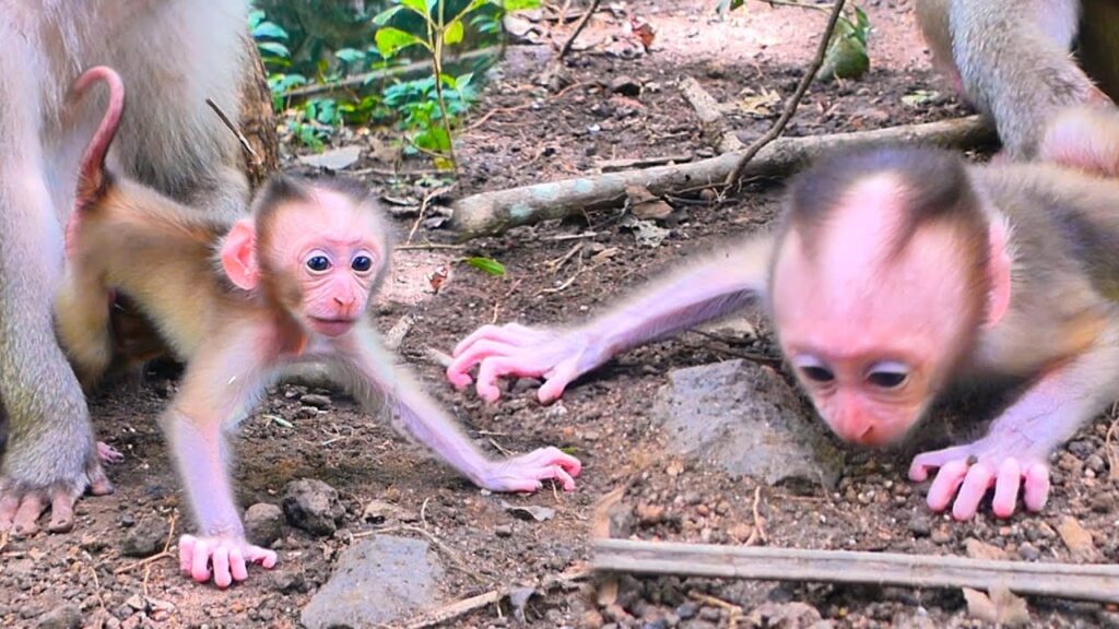 In the gentle morning light, the forest became the stage for a scene that warmed every heart. A tiny baby monkey, only a few weeks old, clung nervously to the branches as its mother settled down on a thick tree trunk. Mama, with her round and heavy belly, looked calm and strong, watching over her surroundings. The baby, however, had only one mission—to reach Mama for a warm and secure hug.