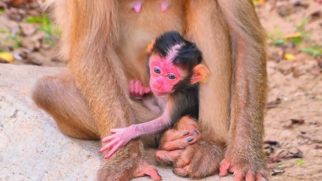 The baby, fragile and tiny, struggled to keep close to its surroundings. Other monkeys seemed too busy, and the newborn risked being left alone. But this young mama stepped in, wrapping her small arms protectively around the baby as though it were her own flesh and blood. She carried the infant carefully, grooming its little face, and keeping it close to her chest. Every movement reflected patience, tenderness, and pure affection.