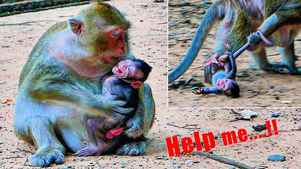 Baby Tia reached out with tiny hands, trying to cling to her mother’s fur. She made soft cries, asking for milk, asking for love. But Queen Mom Tara turned suddenly, anger flashing across her face. In a harsh moment, she grabbed Baby Tia by the tail. The poor baby was dragged, her small body touching the ground, leaves and dust sticking to her fur. Tia cried loudly, her voice full of fear and confusion, not understanding why her own mother treated her this way.