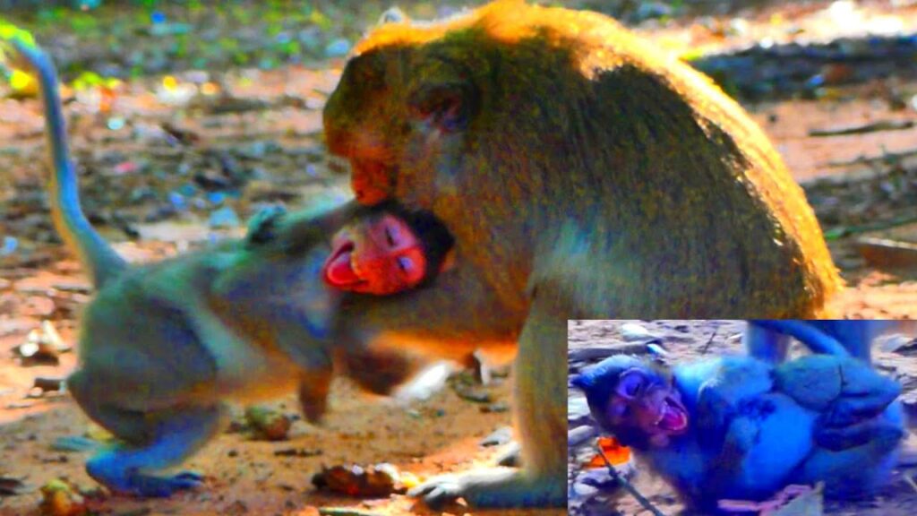 The baby monkey had been playing close to its mother, trying to explore the world with innocent steps. But the big monkey, known for its rough and aggressive nature, suddenly approached. Without warning, it grabbed the little one and attacked harshly. The baby’s tiny body could not defend itself against the heavy blows and bites. The forest echoed with its sharp, painful cries that touched every heart nearby.