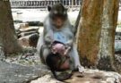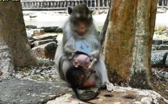 In a quiet corner of the forest, an emotional and surprising moment unfolded that left many people feeling shocked and sad. A tiny baby monkey sat on a branch, crying loudly while holding tightly onto its mother. The sound of the little one’s cries echoed through the trees, and it was clear that the baby felt confused and frightened. The mother monkey seemed strict and distant, pushing the baby away again and again as part of what looked like a tough lesson.