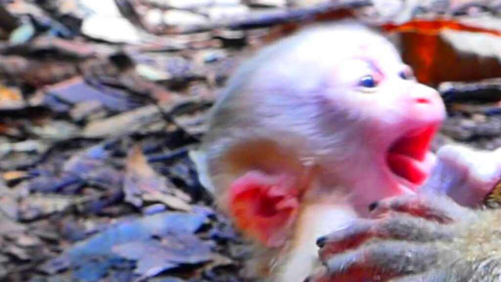 The mother monkey, still young herself, appears nervous and restless. She moves around, glancing at her crying baby but not approaching. Her instincts haven’t yet developed the gentle patience needed for motherhood. Meanwhile, the baby continues to wail, reaching out his tiny hands toward her, begging silently for affection and milk. His big round eyes fill with tears as his cries grow weaker.