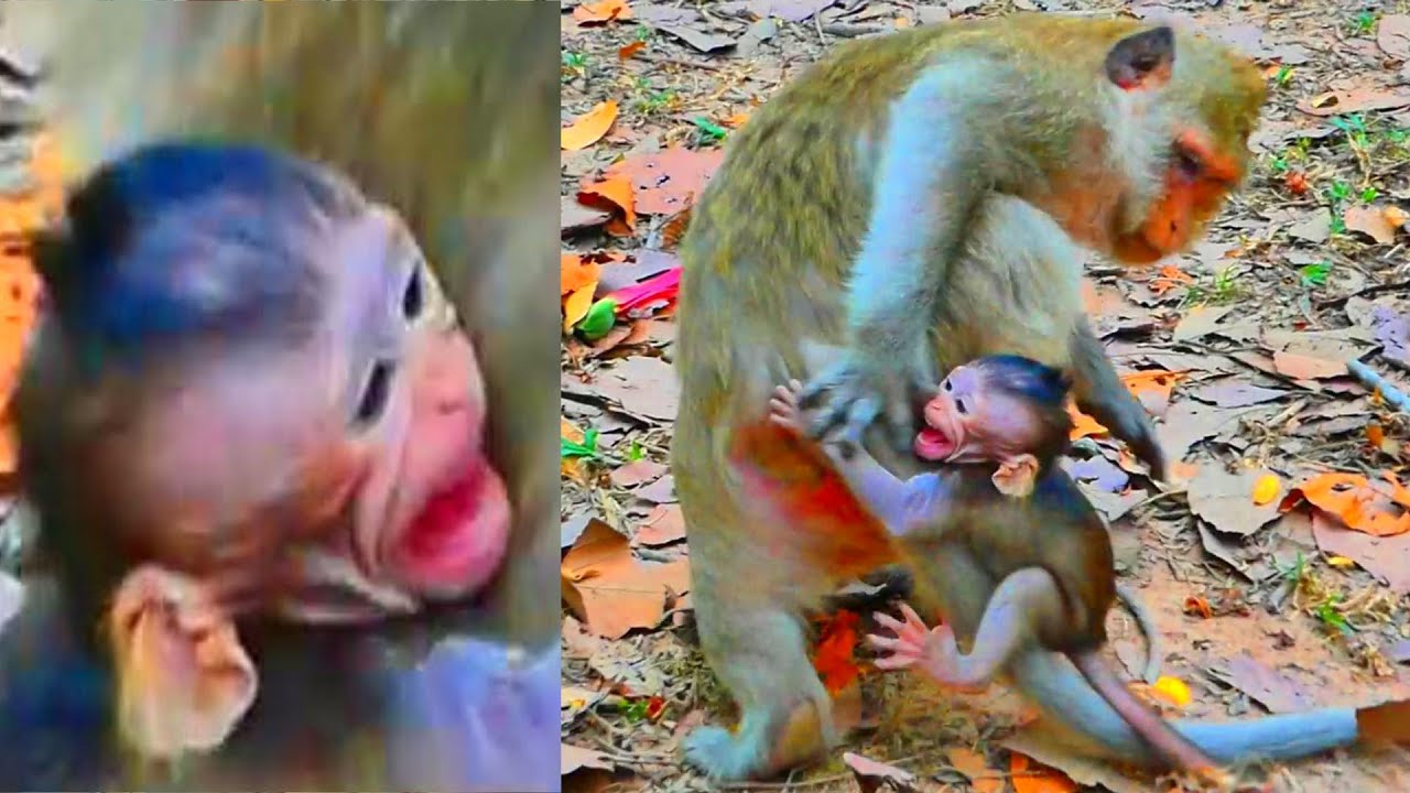 In the quiet morning forest, the leaves moved gently in the warm sunlight. High on a low branch, a tiny baby monkey clung weakly to his young mother. His small body trembled, and soft cries escaped from his throat again and again. He looked tired and confused, as if the world was too big for him.