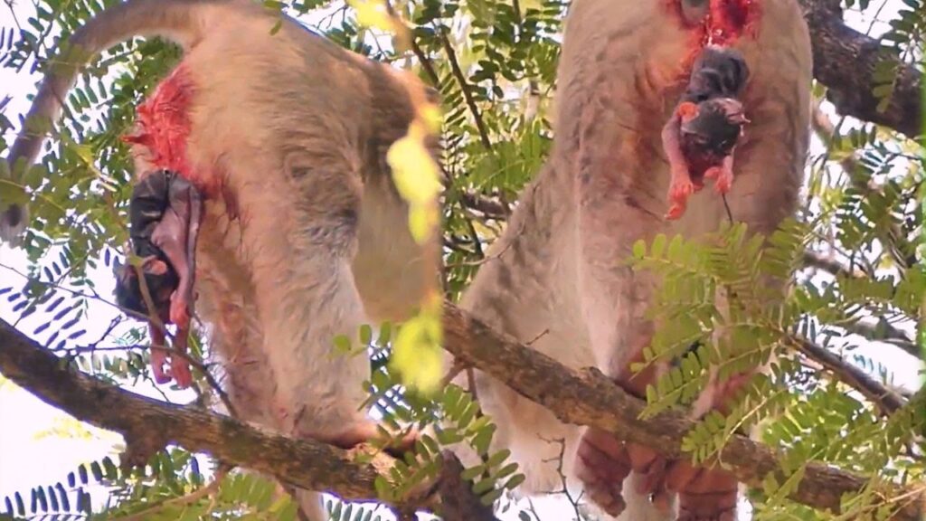 Roby held the newborn close to her chest, her eyes wide with confusion and fear. She gently groomed its thin fur, trying to warm the little body with her own. The baby let out soft, faint cries, struggling to breathe and stay awake. Other monkeys watched from nearby branches, curious but hesitant. Some older females glanced over but did not approach. In the wild, life can be harsh, and Roby now had to fight to keep her baby alive.
