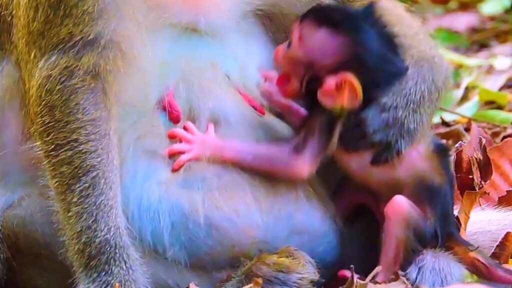 In the quiet corner of the forest, a tiny newborn baby monkey clung tightly to his mother’s thin fur. His eyes were barely open, his body fragile, and his cries filled the air with a heartbreaking sound. The little one was hungry, yet every attempt to find milk became a struggle.