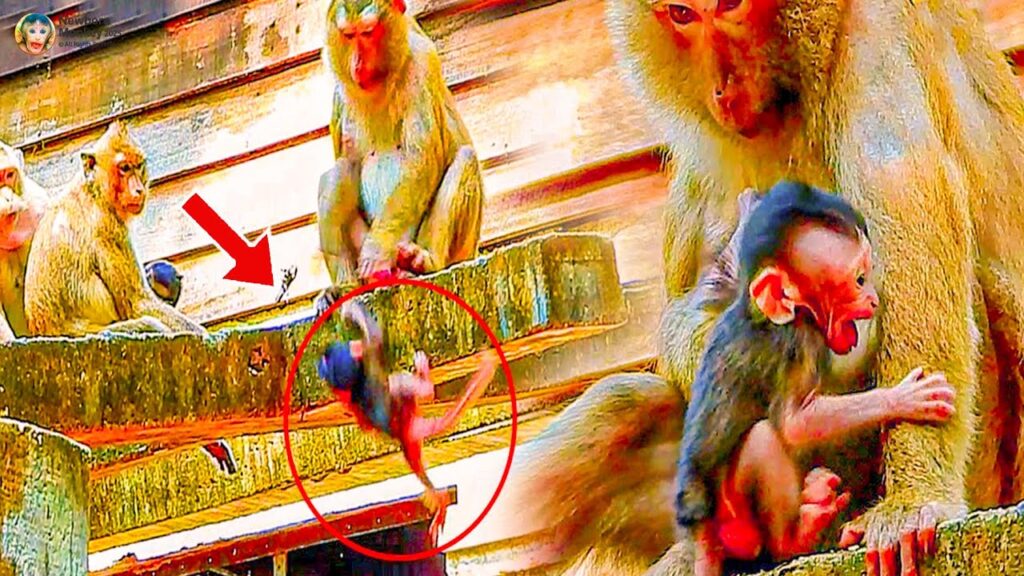 In a heart-stopping moment that left everyone breathless, a baby monkey slipped from his mother’s grasp while they were climbing a tall tree. The playful little one had been squirming and trying to climb on his own, showing off his growing independence. His mom, always alert, tried to hold on tightly, but the little monkey’s sudden wriggle caused him to lose balance. Within seconds, he slipped from her arms and tumbled down toward the ground.