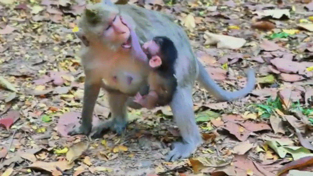 n the quiet corners of the forest, the relationship between a young mother monkey and her newborn is usually filled with love, patience, and gentle care. But sometimes, shocking scenes unfold that reveal the tougher lessons of nature. One young mother, still inexperienced and uncertain, was recently observed training her baby monkey in a way that seemed harsh and even heartbreaking to watch.