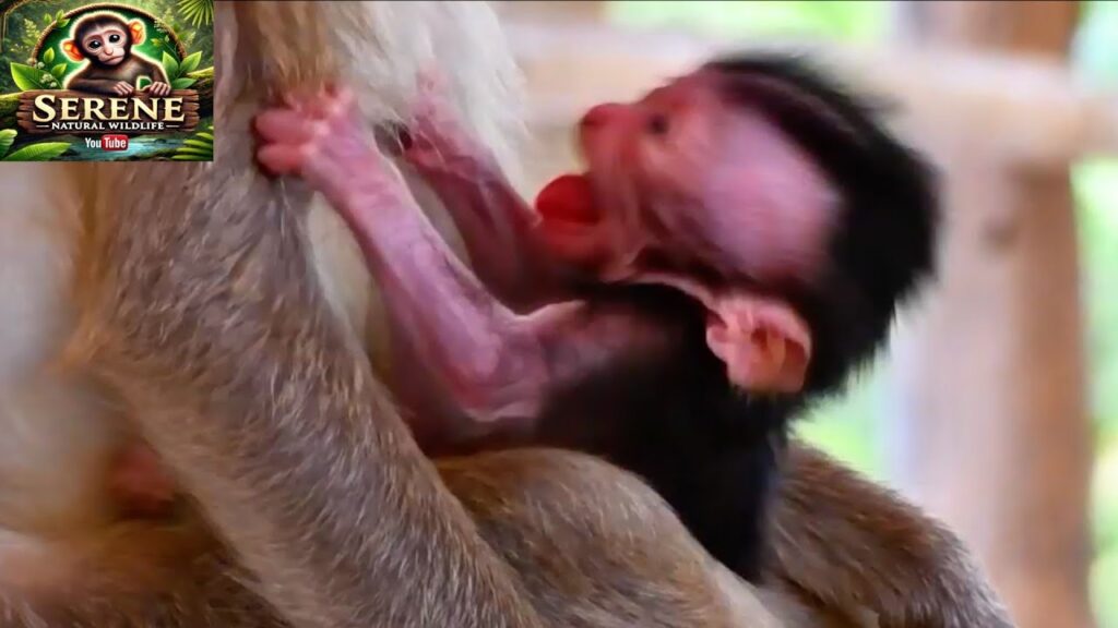 In the peaceful setting of Serene Natural Wildlife, a tiny baby monkey tugs at hearts with its desperate cries for milk. The morning sun gently touches the green canopy, and birds sing softly in the background—but among the calm, the small baby’s whimpers echo with need.