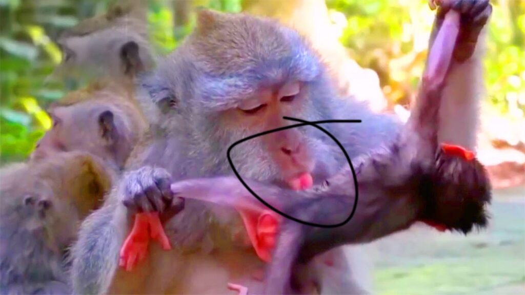 In the quiet stillness of the forest, a heartbreaking scene unfolds. A mother monkey gently grooms her newborn baby, carefully picking dirt and debris from his tiny fur. Her touch is tender, but her expression is distant, perhaps unaware of the chill in the air and the weakness in her baby’s body. The newborn, so small and fragile, lies curled up, his eyes barely open. His tiny limbs shiver uncontrollably. He looks so cold—so helpless.
