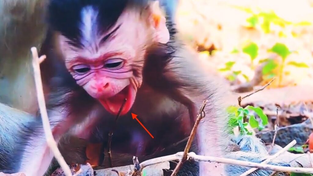 The baby wobbled forward on shaky little arms, sniffing and poking the hard bark. Then, with the innocence only a newborn can show, it opened its tiny mouth wide and tried to bite the trunk. Of course, the wood was tough and dry, completely impossible to chew, but the attempt made the scene hilarious. Each time the baby leaned forward, its mouth formed the funniest shapes—round like an “O,” then stretched wide, then scrunched up in determination. The more the tree resisted, the more the little one tried, showing off a series of adorable and comical expressions.