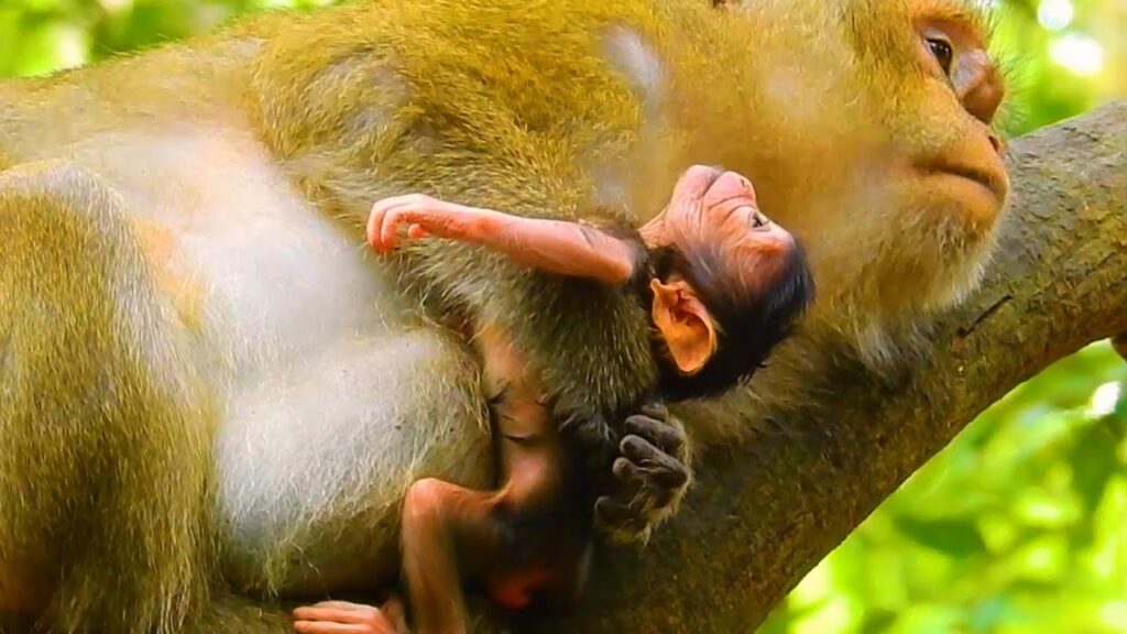Life in the monkey troop is never easy, especially for a young and exhausted mother who has just given birth. The newborn baby clings tightly to her chest, seeking comfort, warmth, and milk. Sadly, the mother appears worn out and overwhelmed, her energy drained from constant challenges around her. She tries her best to protect and feed her baby, but her body shows clear signs of fatigue. The little one, too small to understand, only knows hunger and the need for love, softly crying when milk does not come quickly enough.