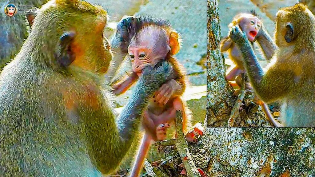 In the soft warmth of the morning light, an unexpected scene unfolded within the monkey troop. Young mother Messi, often known for her playful and carefree nature, revealed a side of herself that few had seen before. With baby Masha clinging gently to her belly, Messi moved with a calmness that was surprising, almost tender, as if she had suddenly matured into her role as a mother.