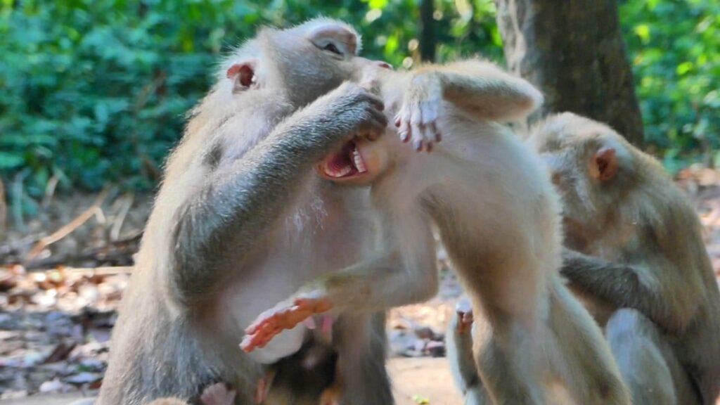 As Lily tried to come closer to her mother for comfort, Libby suddenly reacted in a harsh way. In a moment of anger, Libby bit Lily, causing the small baby monkey to scream loudly. Lily’s cry echoed through the trees, making the moment feel very intense and emotional. The tiny monkey did not understand why her mother acted this way. She looked scared and confused, trying to move away while still calling for help. 😢