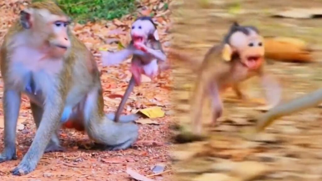 In the high branches of the forest, a tiny baby monkey held tightly onto his mother’s fur. His small hands trembled as he clung to her belly, refusing to let go even for a moment. His eyes, wide with fear, constantly scanned the surroundings. The little one had developed a deep fear of being left behind—an insecurity that seemed far too heavy for his young heart to carry.