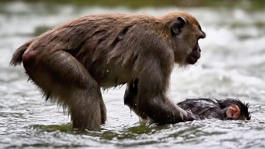 Without hesitation, the mother monkey leapt into action. Her instincts kicked in as she dove fearlessly into the torrent, risking her own life to reach her drowning baby. The river surged around her, threatening to drag her under, but her eyes stayed locked on her struggling infant. Onlookers watched breathlessly as she battled wave after wave, fighting through exhaustion and danger with unmatched determination.