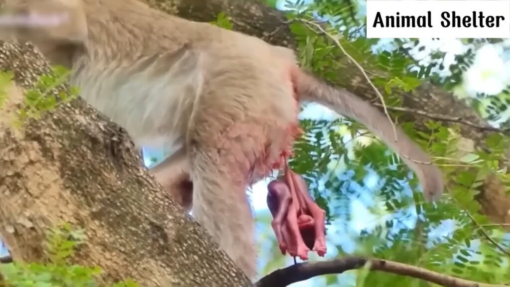In the quiet shadows of the jungle, a heartbreaking moment unfolded as a young mother monkey gave birth too soon. Her tiny infant, born prematurely, arrived into the world frail, underdeveloped, and struggling to survive. The mother, clearly confused and distressed, held her baby gently, her maternal instincts fully awakened despite the sudden, unexpected birth.