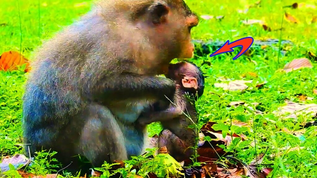 In a heartbreaking scene deep in the forest, a tiny baby monkey desperately clings to its mother’s belly, crying softly with a trembling voice. The poor little one is just a few days old, weak and hungry, yet the mother monkey shows signs of resistance, turning her body away, denying the baby milk. This act of refusal may appear cruel, but it is often a complicated expression of a stressed or overwhelmed mother in the wild.