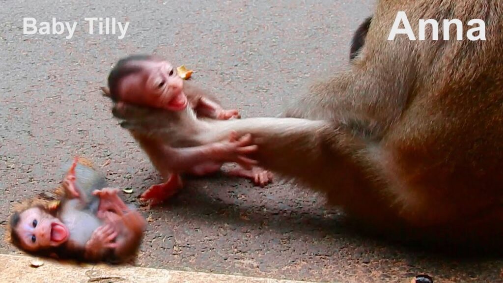 Tilly stumbled, startled by the force. Her cry echoed sharply through the clearing—a loud, trembling wail that carried confusion more than pain. Nearby monkeys lifted their heads, watching the pair with quick, alert glances. Baby Tilly crawled toward her mother, still sobbing, instinctively seeking comfort from the same hands that had just pushed her away.