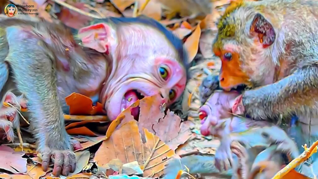 In the peaceful corner of the jungle, a heartbreaking moment unfolded. A little tiny baby monkey, barely a few days old, screamed loudly as it clung tightly to its mother’s belly. The sound of its desperate cries echoed through the trees, piercing the hearts of all who heard. Its tiny mouth opened wide, seeking the comfort and nourishment only its mother could provide — but sadly, she refused to nurse.