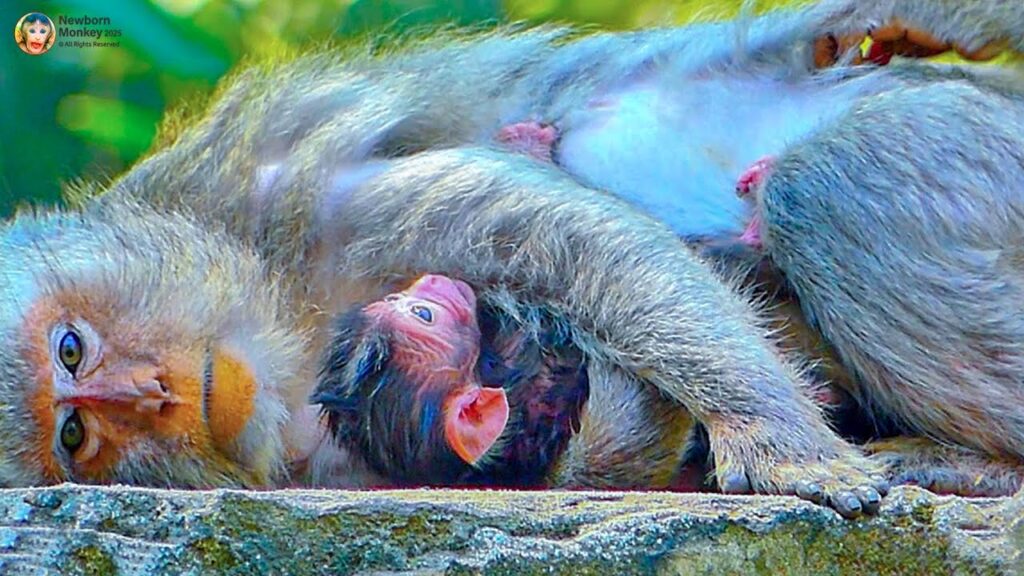 Other monkeys nearby sat in silence, as if recognizing the sacredness of the moment. It was rare to see an older monkey give birth, let alone nurture so immediately after. The scene was raw, real, and powerful — a display of maternal devotion that transcended age and fatigue.