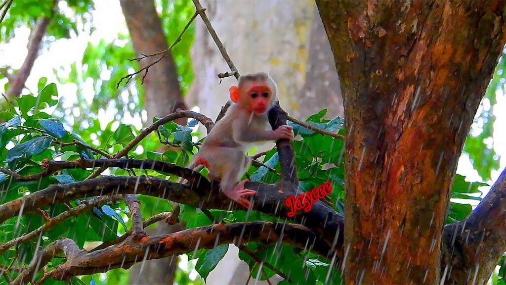 Little Jacee, no more than a few weeks old, clung tightly to the wet bark, his tiny hands trembling. His soft fur was soaked, and his eyes looked around fearfully. Each drop of rain hit his delicate body, making him shiver with cold. He cried out loudly, calling for his mother with high-pitched sobs, hoping she would return soon. But Joyce had climbed down the tree, seemingly ignoring her baby’s cries, disappearing into the forest shadows.