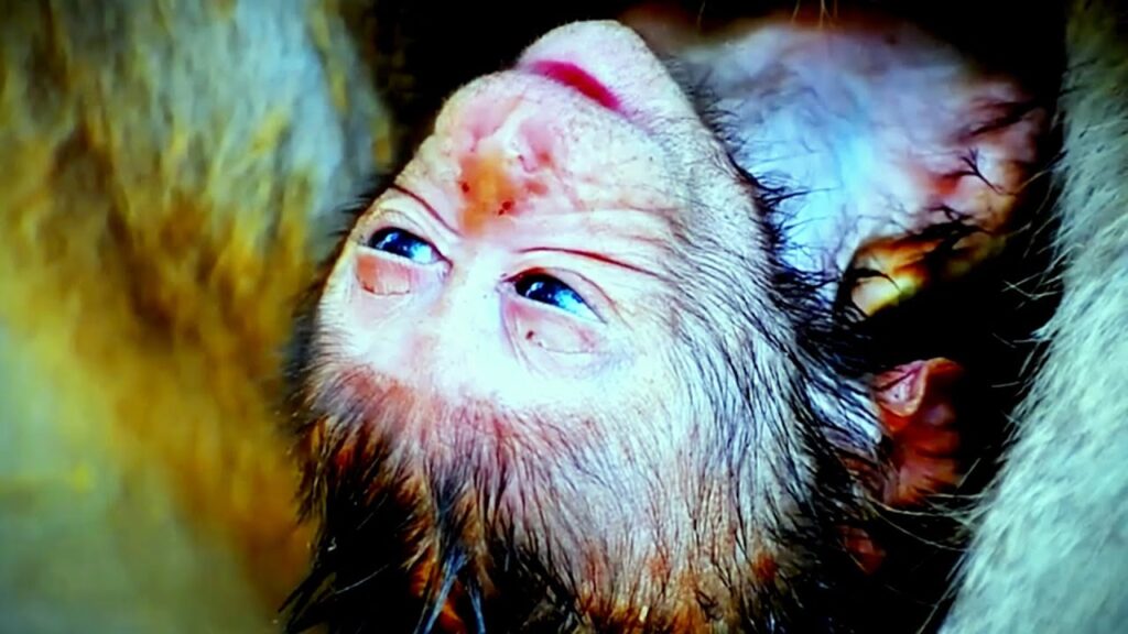 The babies cling tightly to her, their tiny fingers grasping every strand of her wet fur, seeking warmth and comfort. The rain has made everything slippery and cold, yet the bond between mother and child is unshakable. Each movement of the old mother is slow but careful, ensuring her little ones stay safe against her chest. Other monkeys from the group gather around, curious and gentle, welcoming these new lives with soft gestures and watchful eyes.