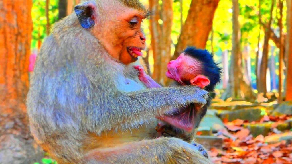 In a quiet corner of the forest, a very young mother monkey sat nervously, holding her tiny newborn close to her chest. It was her first baby, and she didn’t yet understand what it truly meant to care for such a fragile life. The newborn was small, weak, and completely dependent on her warmth and protection. But something felt wrong.