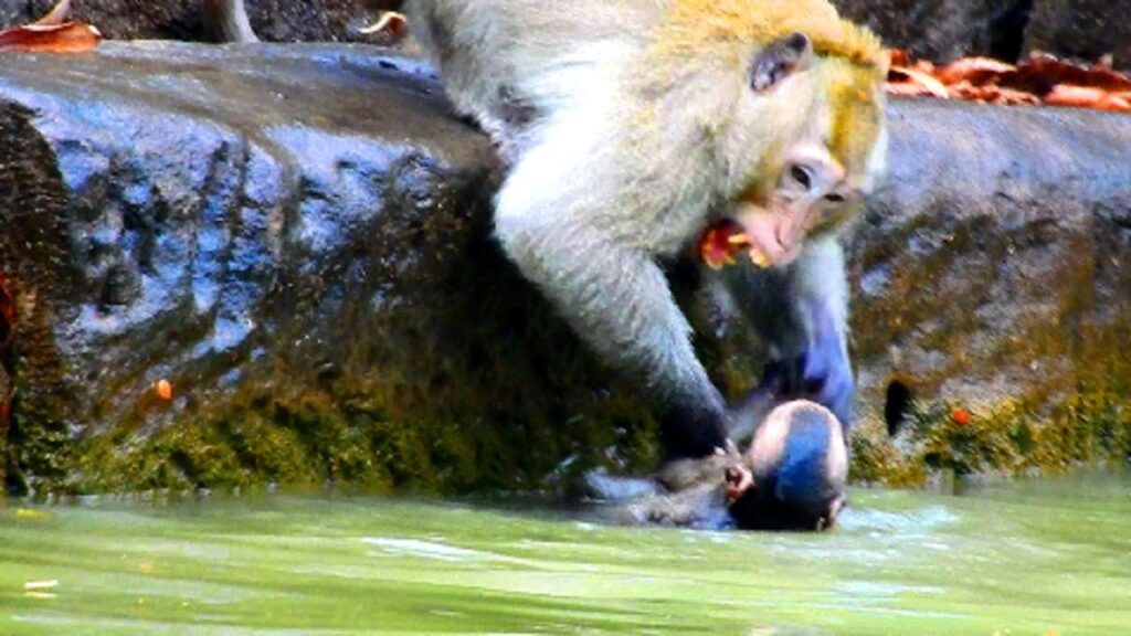 In many monkey families, what looks like “fighting” or “not allowing” a little monkey to swim is often a form of natural protection and teaching. Adult monkeys—especially mothers, aunts, and older siblings—are extremely cautious when a young infant approaches anything risky, and water is one of the biggest dangers in their environment. Even if the water looks calm or shallow to humans, to a tiny baby monkey it can be frightening, cold, slippery, and unpredictable. Adults know this from experience, so their reactions can appear rough, fast, or overly strict.
