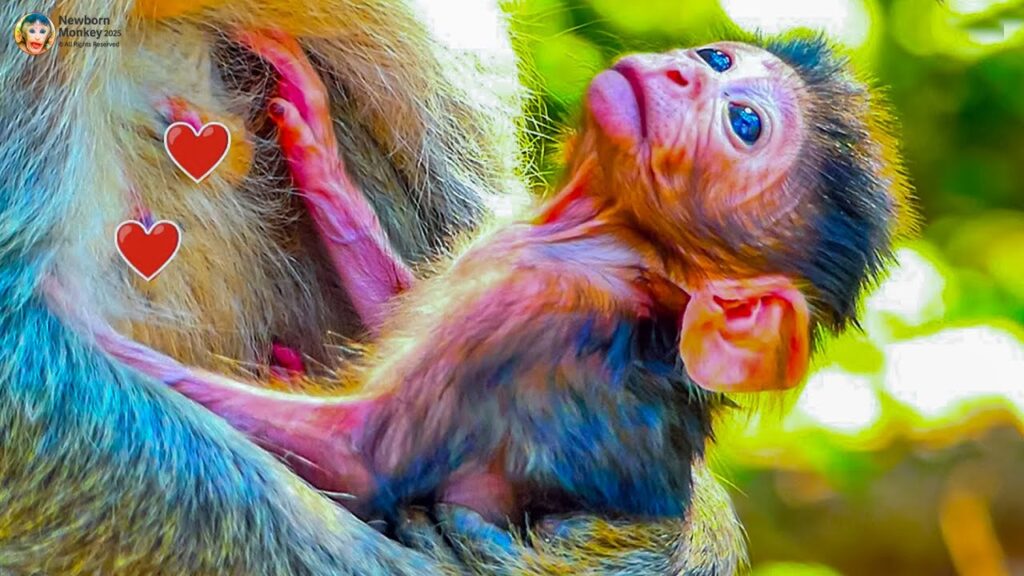 The little newborn, barely a few days old, nuzzles against his mother, eyes still adjusting to the world. His soft fur sticks up in gentle tufts, and his tiny fingers cling to his mother’s belly. With incredible patience, the mother monkey positions him just right and begins to nurse him, all while softly grooming his fur to comfort him.