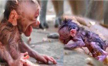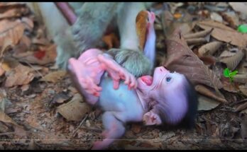 Mother monkey abandons baby monkey after birth, leaving baby monkey crying alone on the ground! A heartbreaking scene unfolded deep in the forest as a newborn baby monkey was left …